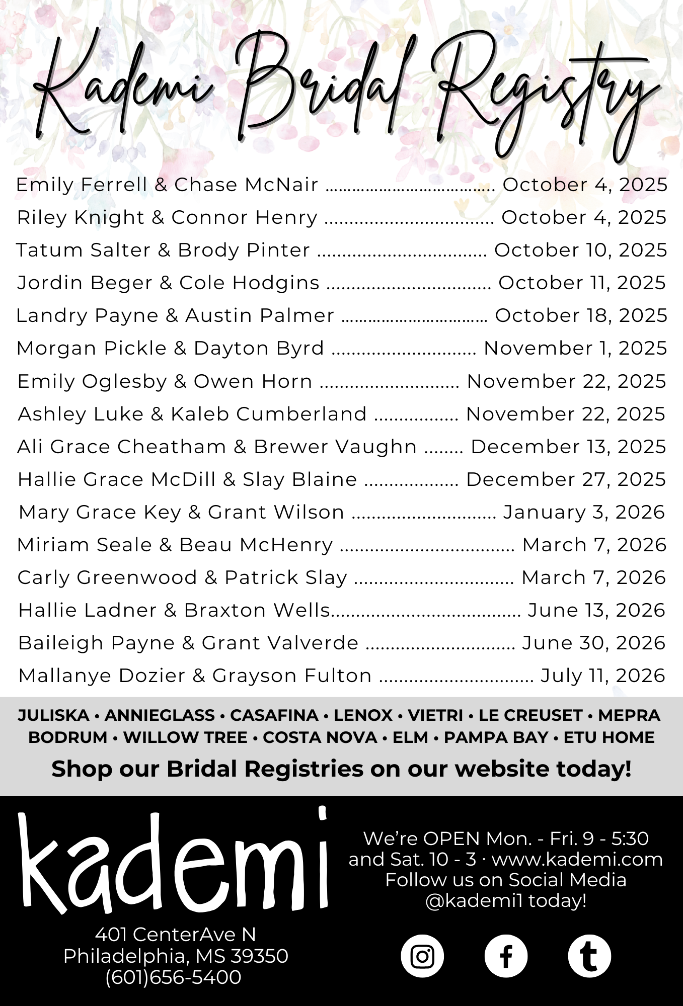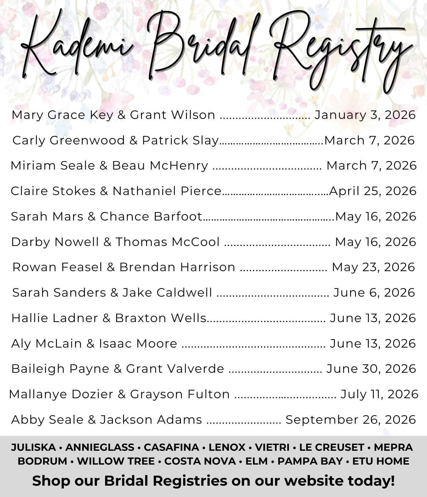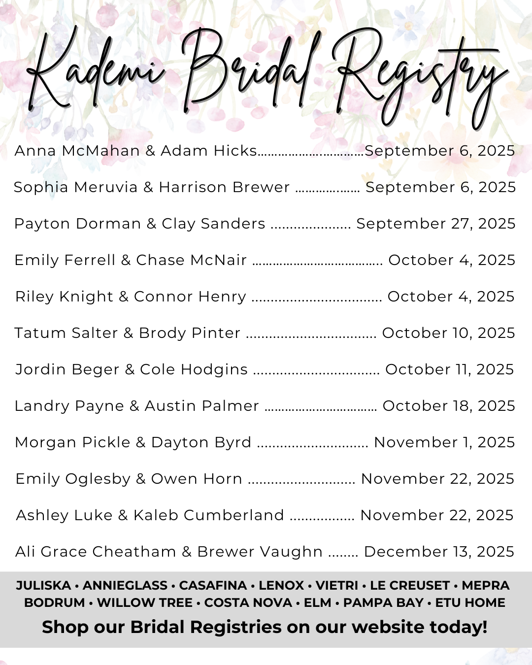 We will then set that time aside for you with Sara, our manager, or with Dawn Lea or Kim, owners of Kademi, to give you our full attention and expertise in creating your perfect gift registry. Whether in-store or virtually, during that time, we will visit with you, acquire all the details of your event, and help you create